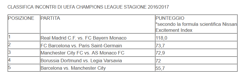 La formula scientifica del “Nissan Excitement Index” calcola un punteggio legato all’”emozione” di ogni singola partita, basato su dati statistici che comprendono: goal segnati, presenza di giocatori di primo piano, biglietti venduti e numero di spettatori. Per esprimere le proprie emozioni sulle partite di UEFA Champions League, si può votare il “Goal Of The Week” nella sezione dedicata del sito Nissan: