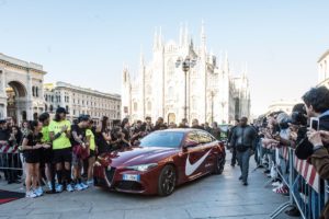 All’evento dedicato alla velocità non poteva certo mancare Alfa Romeo Giulia Quadrifoglio, l’auto più potente mai creata dal marchio per uso stradale, equipaggiata con il potente motore 2.9 BiTurbo benzina da 510 CV – totalmente in alluminio – che assicura prestazioni straordinarie: velocità massima di 307 km/h, accelerazione da 0 a 100 km/h in appena 3,9 secondi e una coppia massima di 600 Nm a 2.500 g/min. L’incontro tra le due stelle della velocità, Carl Lewis e Giulia Quadrifoglio, ha toccato il suo apice quando in piazza del Duomo è apparso l’esemplare rosso che, nel settembre 2016, realizzò sul mitico circuito di Nurburgring, conosciuto dagli appassionati come “Inferno Verde”, il record della categoria sul giro: 7 minuti e 32 secondi. Tempo che oggi campeggia sul cofano della vettura, con la sagoma del “Ring” e le firme del pilota Fabio Francia e dello staff impegnato nella preparazione del bolide Alfa Romeo, che nei prossimi giorni andrà ad arricchire la preziosa collezione del Museo storico Alfa Romeo “La macchina del tempo”.