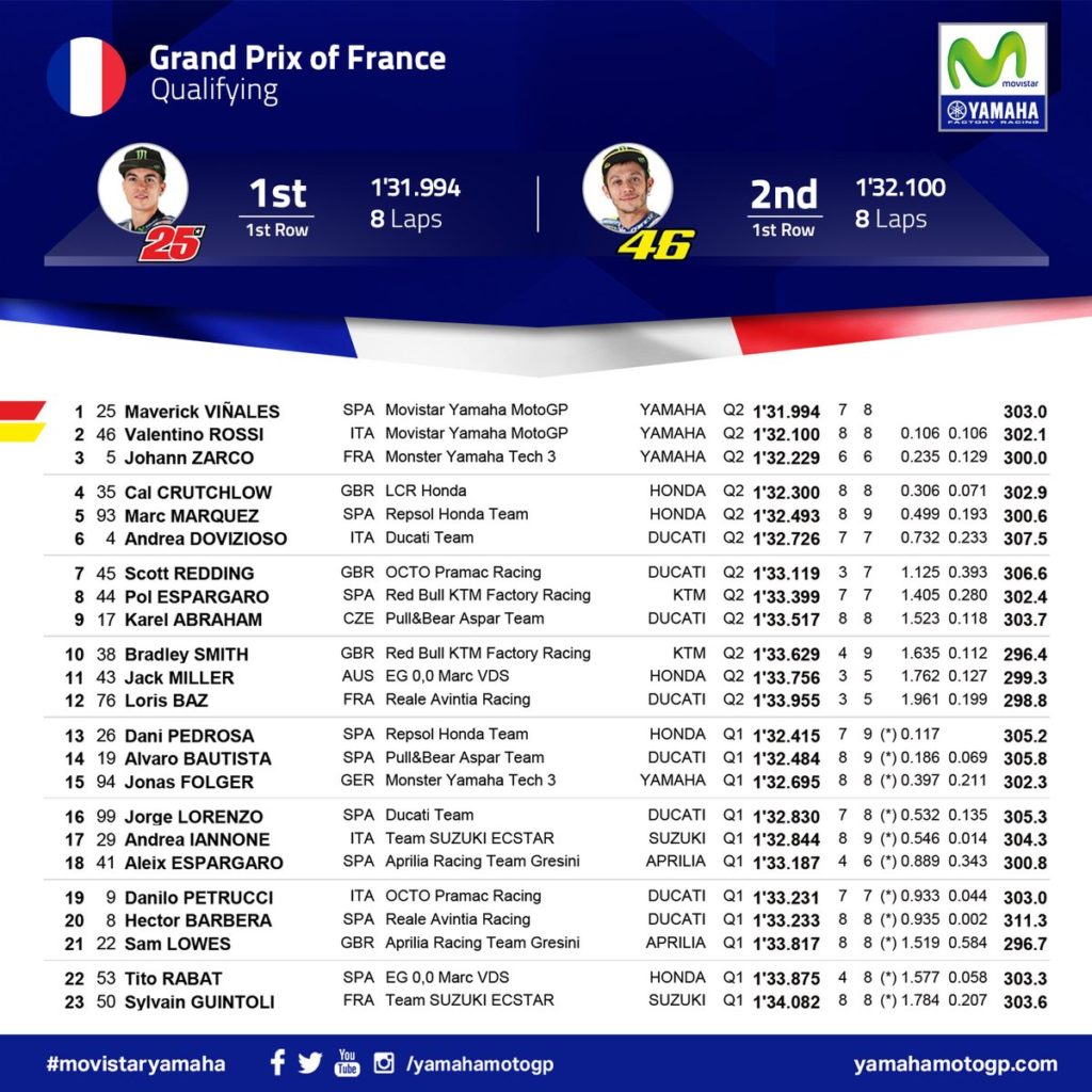 Maverick Viñales torna a primeggiare in qualifica e conquista la pole al GP di Francia, seguito da Valentino Rossi e Johann Zarco con la Yamaha