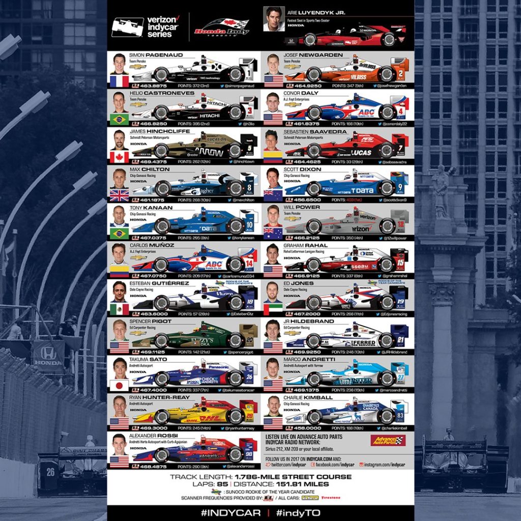 Non solo Formula 1 nel weekend di Sky Sport dedicato alle quattro ruote, che vedrà in pista anche la Verizon #IndyCar Series. Dopo la 300 Giri dell’Iowa, nel fine settimana la serie automobilistica americana sarà di scena a Toronto per la dodicesima prova del campionato. Si corre domenica 16 luglio, in diretta esclusiva su Sky Sport 2 HD a partire dalle ore 21.20 (green flag alle 21.30). Telecronaca di Biagio Maglienti, affiancato da Marcello Puglisi e da Luca Filippi, che nella IndyCar ha corso dal 2013 al 2016.