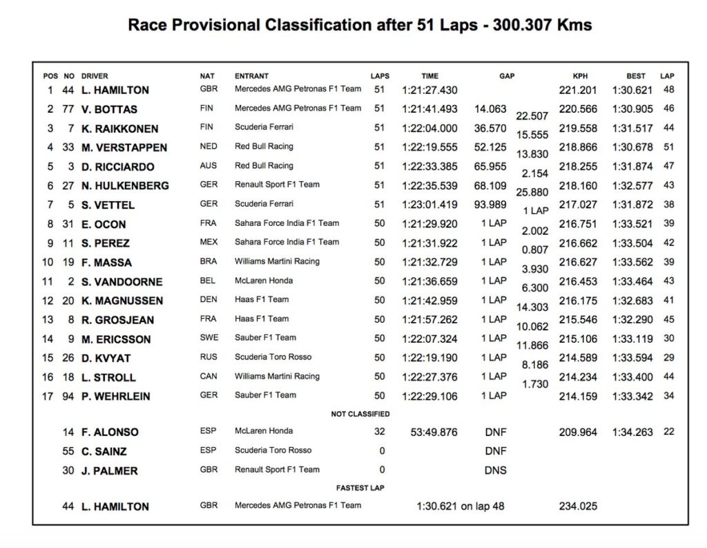 A chiudere la zona punti la Renault di Hulkenberg (mentre Jolyon Palmer si è ritirato prima del via dopo aver causato un secondo giro di formazione), le due Force India di Ocon e Perez e la Williams di Massa. Ed ennesimo ritiro nel giro 34 per Fernando Alonso, con il motore Honda come sempre morto.