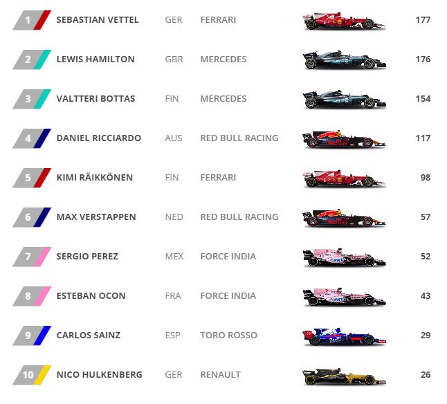 Kimi Raikkonen era saldamente al 2° posto e Vettel al 4°, ma i problemi ai pneumatici sinistri hanno promosso Valtteri Bottas dal 3° al 2° posto, regalando alla Mercedes un’inattesa doppietta. E il secondo posto di Bottas lo porta a 23 punti dal leader a 10 gare dalla fine, con la Mercedes che allunga sulla Ferrari nel Costruttori, + 55 punti.
