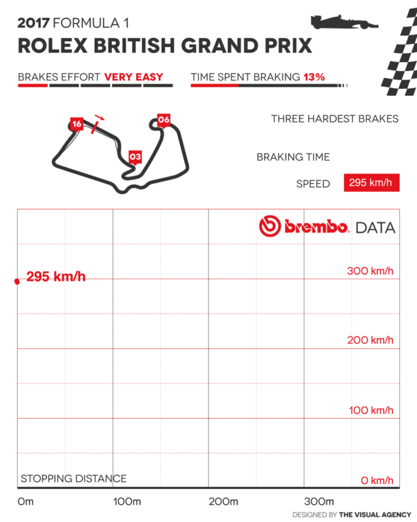 Delle 8 frenate del Silverstone Circuit 2 sono classificate come impegnative per i freni, 2 sono di media difficoltà e 4 sono light. La più dura per l’impianto frenante è quella alla curva 16: le monoposto vi arrivano a 284 km/h e in soli 2,3 secondi scendono a 101 km/h. Per riuscirci i piloti esercitano un carico di 162 kg sul pedale del freno e subiscono una decelerazione di 4,6 g. Durante la frenata le vetture percorrono 52 metri, meno della lunghezza del nuovo schermo che verrà installato in autunno a Piccadilly Circus. La decelerazione è invece di 4,7 g alla curva 3 (Village): la frenata è più lunga sia in termini spaziali (53 metri) che temporali (2,41 secondi) ma il carico sul pedale per passare da 295 km/h a 109 km/h è di “soli” 154 kg. Alle Brooklands (curva 6) le monoposto arrivano a 320 km/h ma entrano in curva a 164 km/h dopo 2,03 secondi di utilizzo dei freni. La decelerazione è di 4,3 g, il quadruplo della Jaguar XKR-S GT che di serie utilizza dischi carboceramici Brembo.