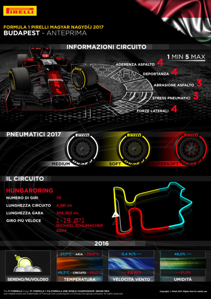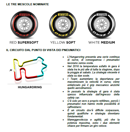 Per il GP di Ungheria sono stati nominati pneumatici P Zero White medium, Yellow soft e Red supersoft: le stesse soluzioni già portate qui nel 2016 e scelte per la quinta volta in questa stagione, l’ultima in Gran Bretagna. L’Hungaroring è però radicalmente diverso rispetto a Silverstone e pur essendo un circuito permanente presenta alcune caratteristiche di uno stradale: curve strette e tortuose, basso livello di grip e ridotte velocità medie sul giro. I