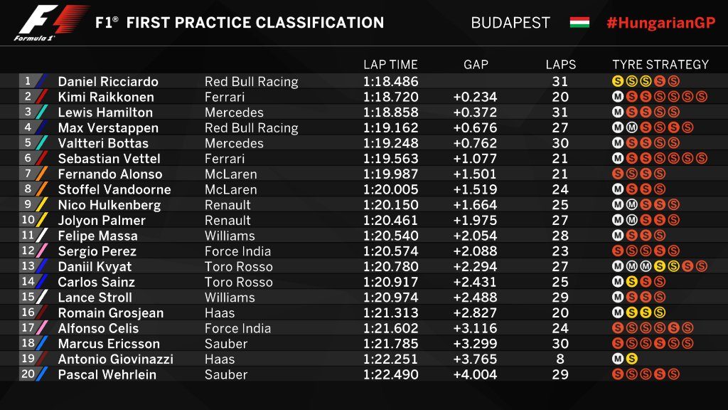 1m 18.486s, precedendo di 0.2s la Ferrari di Kimi Raikkonen e di 0.3s la Mercedes di Lewis Hamilton. Solo Valtteri Bottas e Max Verstappen hanno chiuso entro un secondo da Ricciardo, con Sebastian