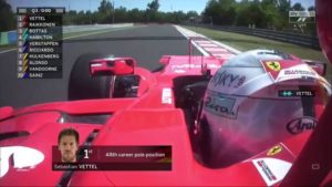 La pole di Vettel, con un tempo di 1.16.276 che sbriciola il precedente record all’Hungaroring, è arrivata nel primo run in Q3, con a seguire Bottas, Verstappen, Ricciardo e Raikkonen, mentre Hamilton ha abortito il giro dopo essere andato largo alla curva 4. L’inglese è stato il primo a uscire per il secondo tentativo e ha fatto il 3° tempo, poi diventato 4° quando Raikkonen ha battuto sia lui sia Bottas, conquistando la seconda posizione (e la terza prima fila Ferrari della stagione, dopo Sochi e Monaco) con un tempo di 1.16.444.