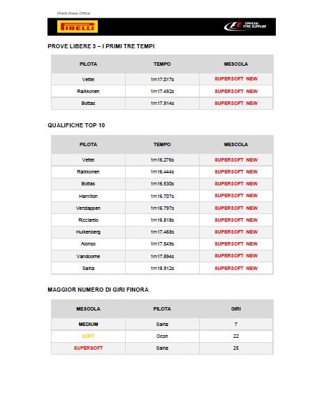 Il pilota Ferrari Sebastian Vettel ha conquistato la pole del GP di Ungheria al termine di una qualifica disputata da tutti esclusivamente con Red supersoft, circa 0,8 secondi più veloci rispetto ai P Zero Yellow soft. I tempi sul giro sono migliorati costantemente, con il precedente record dell’Hungaroring che era già stato battuto nelle FP2. Già nel Q2 due piloti sono arrivati all’1m16, mentre nel Q3 i primi sei sono scesi sotto