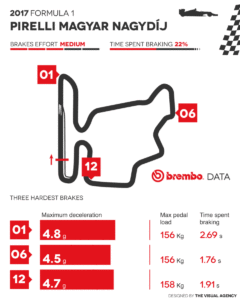Delle 11 frenate dell’Hungaroring 2 sono classificate come impegnative per i freni, 7 sono di media difficoltà e le 2 restanti sono light. La più dura per l’impianto frenante è la prima curva dopo il traguardo: le monoposto vi arrivano a 320 km/h e scendono a 91 km/h in soli 65 metri, meno del doppio della lunghezza di un campo da pallanuoto. I piloti esercitano un carico sul pedale del freno di 156 kg per 2,69 secondi e subiscono una decelerazione di 4,8 g. Anche la frenata alla curva 12 è tosta: la velocità delle auto passa da 288 km/h a 118 km/h in soli 1,91 secondi e 49 metri. Notevole lo sforzo richiesto ai piloti: 4,7 g di decelerazione e 158 kg di carico sul pedale del freno. Alle curve 8, 9 ed 11 invece il freno serve invece per perdere dai 35 km/h ai 55 km/h scalando una marcia: per ciascuna di queste frenate bastano dai 10 ai 16 metri, anche se il carico sul pedale non è per niente insignificante, essendo compreso fra 75 kg e 121 kg.