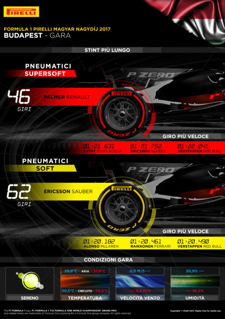 sono stati contenuti nel primo stint e si sono ridotti grazie anche all’ingresso della safety car nei primi 4 giri, che ha aiutato i piloti ad andare verso un solo pit-stop. Quasi tutti sono partiti con pneumatici Red supersoft, quasi un secondo più veloci rispetto ai Yellow soft scelti al via da Daniil Kvyat su Toro Rosso e del terzo pilota Williams Paul Di Resta. Fernando Alonso (McLaren) ha firmato il giro più veloce in gara in 1m20.182s, inferiore quasi tre secondi rispetto al 2016. I team rimarranno a Budapest per il secondo test in-season, durante il quale scenderanno in pista molti giovani piloti. Mercedes sarà impegnata martedì con una monoposto nel test di sviluppo dei pneumatici 2018.