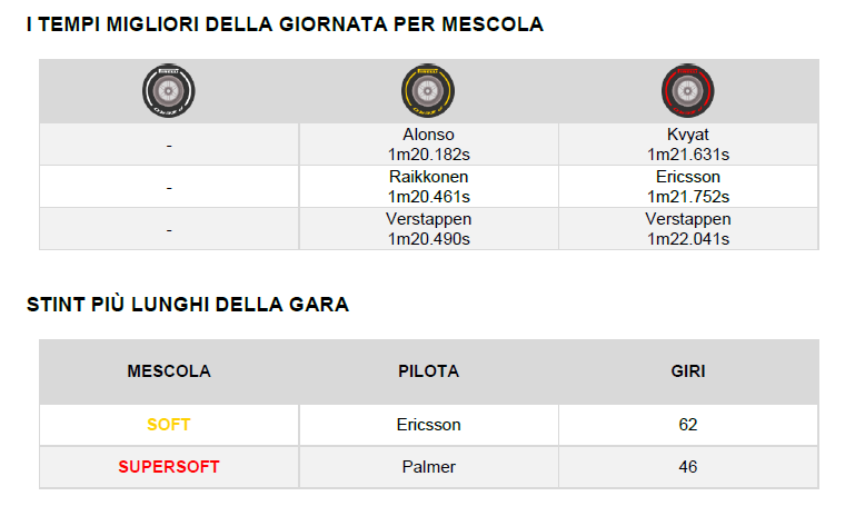 LA PREVISIONE PIRELLI Come previsto, la maggior parte dei piloti ha adottato una strategia a una sola sosta per evitare il traffico, anziché effettuare le due soste che erano secondo noi teoricamente più veloci, ma con un vantaggio minimo. Vettel si è fermato per cambiare da supersoft a soft al giro 32. Entrambi i piloti Sauber hanno optato invece per le due soste.