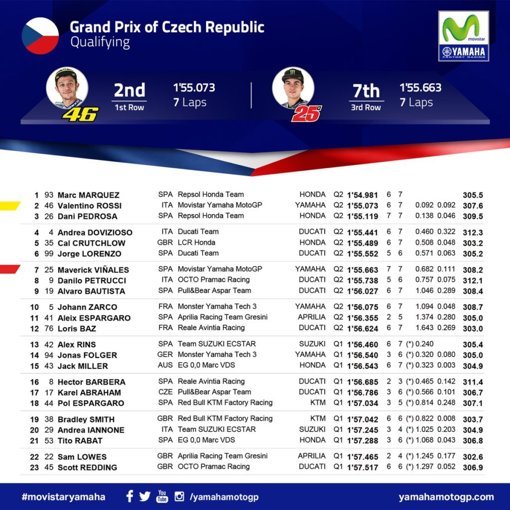 Secondo tempo per Valentino #Rossi nelle qualifiche del GP della Repubblica Ceca a #Brno, dove il portacolori Movistar #Yamaha riesce a fare un grande passo in avanti rispetto alle prime libere di venerdì e sfida in campo aperto le Honda ufficiali, dominatrici delle qualifiche. 1:55.073s il miglior tempo del Dottore che paga un ritardo di 0,092s dall’autore della pole, Marc Marquez, pochissimo, in previsione di una gara che si preannuncia una sfida all’ultimo metro, probabilmente segnata anche dalle avverse condizioni meteo.