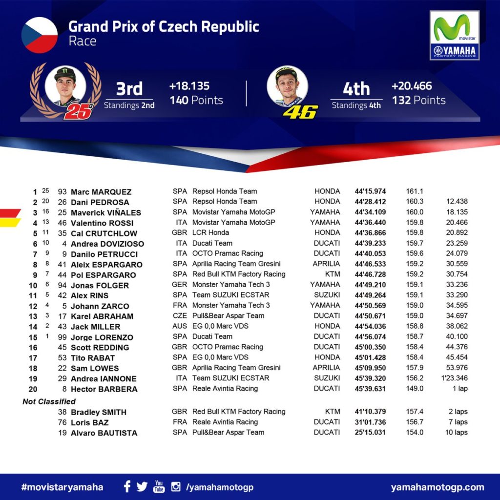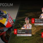 Repsol Honda. Sul podio con lui il compagno di squadra Dani Pedrosa e la Yamaha di Viñales, seguito da Valentino Rossi, autore di una grande rimonta, ma finito fuori dal podio, come peraltro aveva previsto ieri.