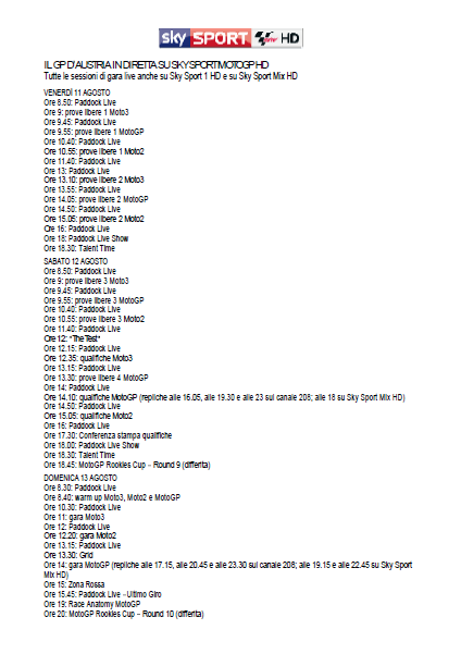 Dopo Brno, il #Motomondiale resta in Europa e tra giovedì 10 e domenica 13 agosto sarà di scena sul circuito di #Spielberg per il GP d’Austria, undicesimo round della stagione in diretta su Sky Sport MotoGP HD. Quattro giorni da vivere anche attraverso i 5 canali del mosaico interattivo in HD, per un totale di circa 30 ore live. Guido Meda commenta le sfide della top class assieme a Mauro Sanchini. Zoran Filicic racconta la Moto3 insieme a Sanchini e la Moto2 con Roberto Locatelli. Studi condotti da Vera Spadini. Il weekend inizia oggi con la conferenza stampa dei piloti alle 17.00. Di seguito scheda, classifica e tutti gli orari del weekend.