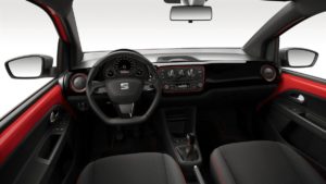 Gli interni, in linea con lo stile sportivo della Mii FR Line, presentano volante sportivo e pomello del cambio rivestiti in pelle con impunture rosse, sedili con logo FR Line, console centrale in colore nero lucido con bordi rossi, cielo dell’abitacolo nero e battitacco personalizzato FR Line.Infine, per la Mii FR Line sono disponibili su richiesta la versione cinque porte e il ruotino di scorta da 14” con limitatore di velocità (per la versione 1.0 MPI).