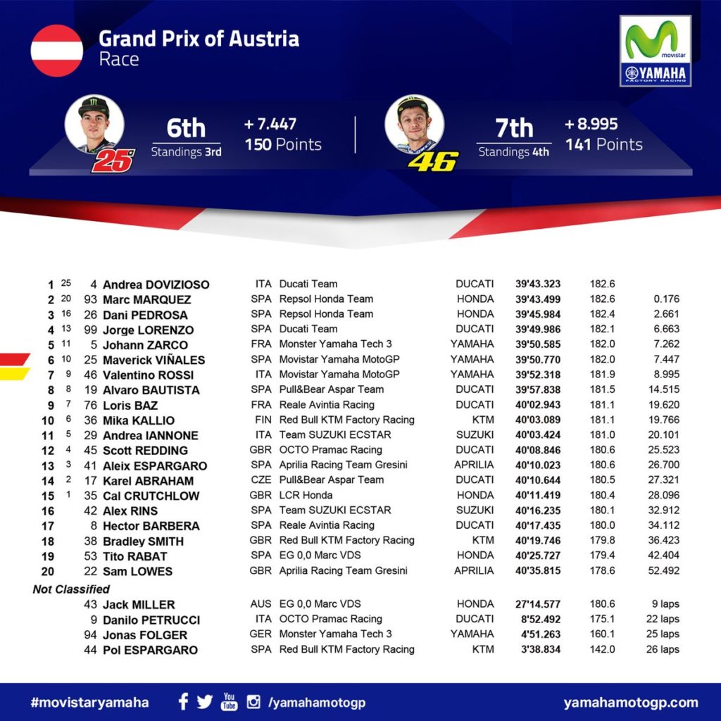 Valentino Rossi parte bene ed è quarto. Al via prova ad attaccare Dovizioso che si difende. Resta in quella posizione prima di scivolare al 7° posto a causa di un errore alla curva 1. La prova del Dottore si chiuderà in quella posizione dietro al compagno di box Maverick Viñales che incassa 10 punti iridati ma che non sono abbastanza per difendere la piazza d’onore in classifica generale. Ora è terzo a 8 punti da Dovizioso. Per Petrucci una partenza da dimenticare e la perdita di molte posizioni, fino al ritiro a causa di un problema alla moto. Andrea Iannone chiude 11° dopo una gara costante alle spalle dell’ottimo Mikka Kallio (Red Bull KTM Factory), 10° alla bandiera a scacchi che porta per la seconda volta la moto austriaca nella top 10. Prossimo appuntamento, il GP d’Inghilterra da venerdì 25 agosto a Silverstone.