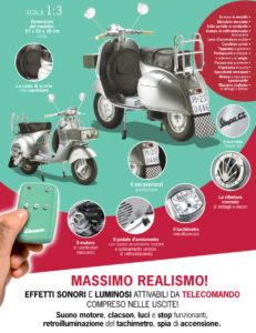 A ogni uscita dell’opera sono allegati i componenti per costruire, passo dopo passo, la Vespa e un fascicolo con dettagliate istruzioni per il montaggio, e sezioni dedicate al mondo Vespa. E in più, con la prima uscita, un DVD con l’anteprima di tutte le principali fasi di montaggio della fedele replica in scala 1:3, e tutti i suoi sorprendenti dettagli: carrozzeria in metallo, sellino apribile in similpelle, manubrio sterzante, cavalletto e ventola di raffreddamento funzionanti, e in più luci e l’inconfondibile suono del motore a due tempi attivabili tramite telecomando incluso nelle uscite. La collezione è realizzata su licenza ufficiale Piaggio S.p.A.