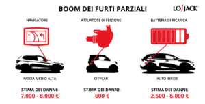 Il business dei furti è sempre più organizzato e al passo con i tempi e, grazie al supporto delle nuove tecnologie, riesce a colpire in maniera mirata ed efficace: se il recupero non avviene entro le prime 36 ore dal furto, le possibilità di rinvenire la vettura si riducono drasticamente. Boom dei cosiddetti furti parziali di preziose componenti interne all’abitacolo: su tutti, navigatori satellitari, pneumatici, attuatori della frizione (smart), volanti multifunzione, fari a led e batterie di vetture ibride. Sono questi i principali indicatori che emergono dall’analisi “L’evoluzione dei furti d’auto”, elaborata da LoJack, la società americana inglobata nel colosso della telematica CalAmp e leader anche nel rilevamento e recupero di beni rubati.