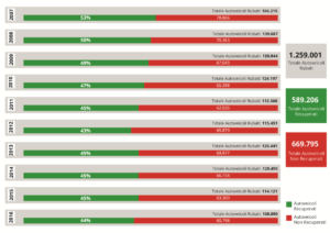I dati degli ultimi anni evidenziano in modo inequivocabile la graduale lenta riduzione delle sottrazioni criminali di auto, cui però fa da contraltare il costante e più significativo calo dei tassi di recupero dei veicoli rubati, passati dal 53% del 2007 al 44% dello scorso anno. In 10 anni è sparito nel nulla un parco auto di 670mila unità, mentre 589.206 sono state restituite ai legittimi proprietari, a fronte di un complessivo numero di furti pari a 1.259.000 unità.