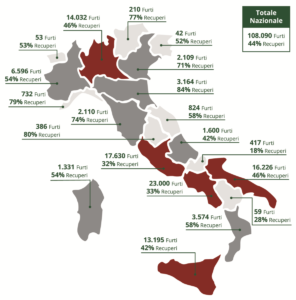 Come da tradizione, l’Italia dei furti d’auto presenta tassi di rinvenimento a macchia di leopardo. Tra le regioni colpite in modo significativo (con più di 1.000 episodi) dalla piaga dei furti, in Emilia Romagna (recuperato l’84% dei veicoli rubati), in Toscana (74%), Piemonte (54%) e Sardegna (54%) gli automobilisti hanno maggiori possibilità di riabbracciare il proprio veicolo.
