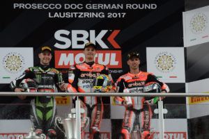corso dell’undicesimo giro Davies sferra l’attacco decisivo a Rea e si riprende la testa della corsa, nel frattempo Sykes riesce a portarsi in quarta posizione ma il ritardo accumulato dal gruppo di testa è di quasi 12 secondi. Al diciannovesimo giro viene esposta la bandiera bianca con croce rossa perché sul circuito tedesco iniziano a cadere alcune gocce di pioggia nel settore 4 della pista. Questo non pregiudicherà la corsa e Chaz Davies andrà a tagliare il traguardo per primo con un vantaggio di oltre due secondi sul Campione del Mondo in carica e di oltre quattro su Marco Melandri, terzo sotto la bandiera a scacchi.