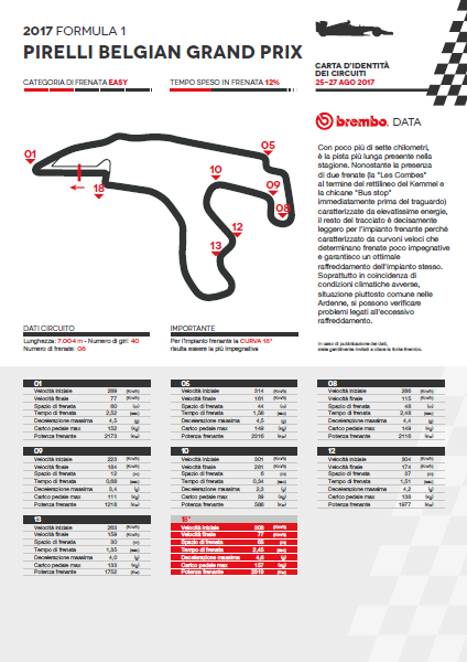 Delle 8 frenate del Circuit de Spa-Francorchamps solo una è classifica come impegnativa per i freni, 5 sono di media difficoltà e le 2 restanti sono light. La più dura per l’impianto frenante è la penultima curva prima del traguardo: le monoposto vi arrivano a 308 km/h e scendono a 77 km/h in soli 65 metri, meno della metà dello spazio necessario ad una station wagon per arrestarsi partendo da 200 km/h. Ai piloti di Formula 1 basta frenare per 2,45 secondi ma devono applicare una forza di 157 kg sul pedale del freno ed affrontano una decelerazione di 4,6 g. Notevole è anche la frenata alla curva La Source (curva 1) perché le monoposto perdono oltre 200 km/h, passando da 289 km/h a 77 km/h in 2,52 secondi e 60 metri. Un pizzico più contenuto è lo sforzo per i piloti: 152 kg di carico sul pedale e 4,5 g di decelerazione. Rispetto agli anni passati, complice la maggiore dimensione dei pneumatici che permette l’ingresso in curva a velocità maggiori, si è ridotta la frenata alla curva Les Combes (curva 5): le auto iniziano a svoltare a 161 km/h dopo aver quasi dimezzato la loro velocità in 1,58 secondi e 44 metri.