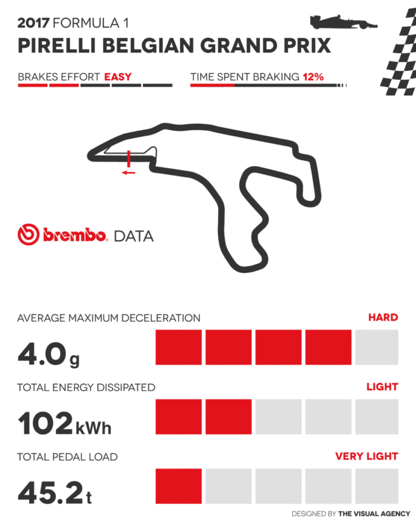 Pur essendo una pista lunghissima i freni sono usati appena 8 volte al giro, come a Barcellona che però è più corto di 2,3 km. Oltre tutto sulla pista belga 2 delle 8 frenate durano meno di un secondo. Ciò spiega perché ogni giro i freni siano usati per meno di 13 secondi: così come a Monza, quindi, i freni entrano in funzione solo nel 12 per cento della gara. La decelerazione media sul giro è di 4 g, valore identico a Baku e a Budapest: ad abbassare la media sono le frenate dei settori 2 e 3, con l’eccezione della chicane nel punto che un tempo era chiamato Bus Stop (curva 18). Tutto ciò naturalmente si traduce in un’energia dissipata in frenata da ogni vettura durante l’intero GP inferiore ad altri tracciati: i 102 kWh sono meno della metà dell’Hungaroring. Questo valore equivale al consumo giornaliero di 7 vasche idromassaggio (spa tub) di medie dimensioni. Dalla partenza alla bandiera a scacchi ciascun pilota esercita un carico totale sul pedale del freno di 45 tonnellate. Pur inferiore ad altri GP è comunque uno sforzo non da poco perché equivale a quasi 5 quintali e mezzo per ogni minuto di gara.
