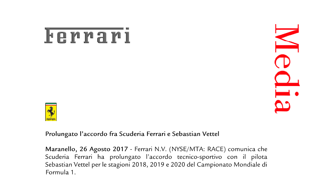 “Maranello, 26 Agosto 2017 – Ferrari N.V. (NYSE/MTA: RACE) comunica che Scuderia Ferrari ha prolungato l’accordo tecnico-sportivo con il pilota Sebastian Vettel per le stagioni 2018, 2019 e 2020 del Campionato Mondiale di Formula 1“.