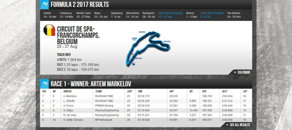 così come il secondo classificato Oliver Rowland, per via del consumo anomalo del fondo vettura. Secondo la squadra, oltre a essere minimo (meno di 0,2 mm in uno dei 7 punti di misurazione) il danno è stato accidentale e accentuato dalle caratteristiche del circuito belga. Il team Prema ha deciso di non presentare appello. Leclerc resta in testa alla classifica con un margine di 54 punti. Trae invece vantaggio dalla vicenda Antonio Fuoco, che conquista quindi il secondo podio della stagione con il 3° posto. La Prema si scusa per l’incidente e si assume la responsabilità di quanto accaduto e che ha privato Charles Leclerc di una chiara vittoria in pista. Sul podio di Gara 1 salgono quindi i due piloti del team Russian Time Markelov e Ghiotto, oltre come detto ad Antonio Fuoco.