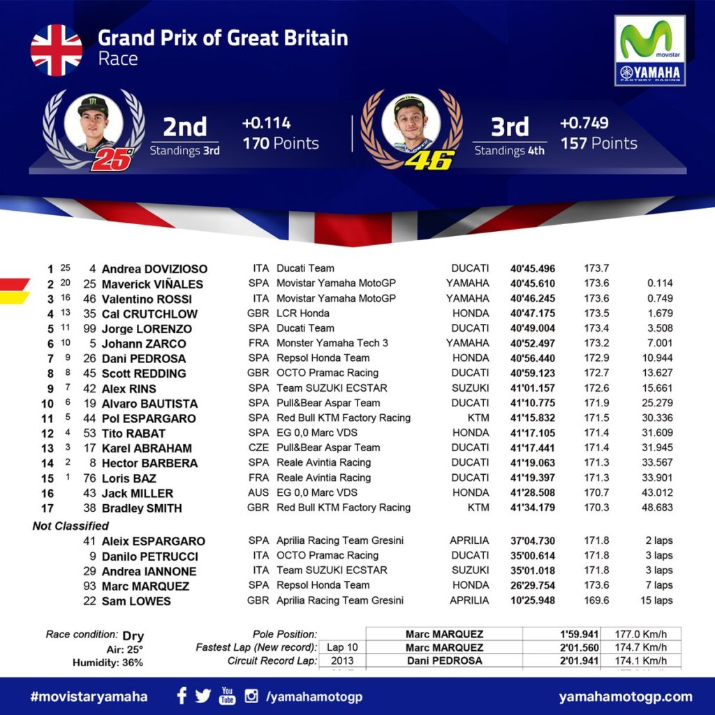 Rossi parte come un fulmine ed è davanti a tutti. Al secondo giro ha già un 1″2 sugli inseguitori ma non riesce ad andar via. Resta a distanza controllata mentre dietro la lotta per la seconda posizione non conosce pause. Da questa emerge la Ducati che lo costringe alla seconda piazza poi persa con Viñales. Rossi ora è quarto in campionato con 157 punti. Dovizioso è la stella della domenica. Scattato dalla sesta casella sulla griglia, recupera una posizione ai danni del collega di box Jorge Lorenzo. Dopo qualche giro ha la meglio anche su Cal Crutchlow. La grande gara di Dovizioso prosegue attaccando con successo Marquez alla curva 1 nel corso del decimo passaggio e arrivando al secondo posto dopo aver superato Viñales. Attende qualche giro, affila le armi e a meno 3 dalla fine mette dietro Rossi. Anche il ritorno di Viñales che ha avuto al meglio su Rossi non lo impensierisce e vince, ancora, in Inghilterra là dove aveva raccolto il primo successo in MotoGP. Ora comanda la classifica con 183 punti.