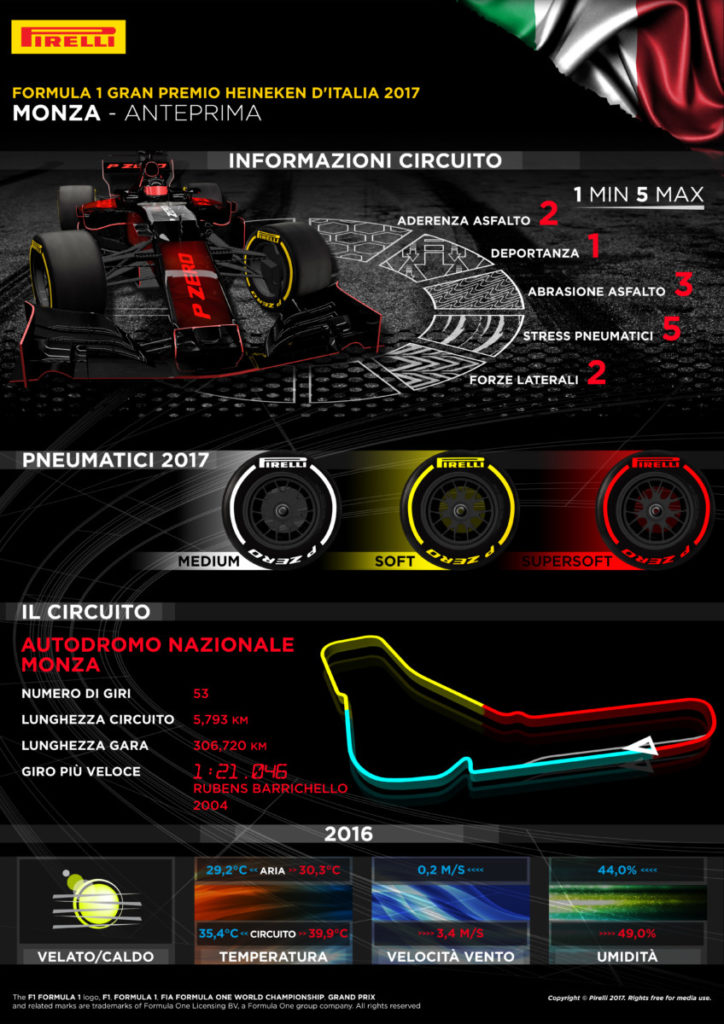 MARIO ISOLA – RESPONSABILE CAR RACING: “Con le monoposto 2017 potremmo vedere velocità massime simili o inferiori rispetto al 2016 su questo circuito, ma sempre con carichi molto elevati sui pneumatici a causa della deportanza extra imposta dai nuovi regolamenti. La combinazione di deportanza e velocità descrive la mole di lavoro a cui sono sottoposti i pneumatici su questa pista. La scelta delle mescole è stata influenzata anche dal rischio di blistering sulle gomme date le numerose aree di frenata in rettilineo, con l’area di camber sulla spalla che tende a surriscaldarsi. In passato la gara di Monza è stata spesso condizionata dal meteo e, vista l’estate torrida in Italia, possiamo aspettarci temperature elevate nel corso del fine settimana. Questo fattore potrebbe influenzare il comportamento dei pneumatici: le prove libere saranno quindi fondamentali per i Team per studiare le diverse possibili strategie”.