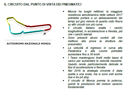 Per il GP di casa a #Monza #Pirelli ha nominato i pneumatici P Zero White medium, Yellow soft e supersoft, la stessa scelta di un anno fa. Queste mescole offrono il giusto compromesso tra prestazioni e durata, necessario sul circuito noto come il “tempio della velocità” dove i pneumatici affrontano carichi importanti imposti dalle velocità elevate. Con le monoposto in versione 2017 le velocità in curva saranno