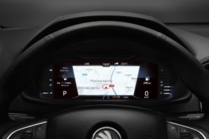 Lo schermo viene interamente occupato dalla visualizzazione di una specifica funzione, per esempio la mappa di navigazione, lasciando spazio nella parte bassa del display per le informazioni essenziali, quali la velocità effettiva, la marcia inserita, i cartelli stradali riconosciuti dal sistema di bordo, oltre alle indicazioni sulla navigazione.karoq