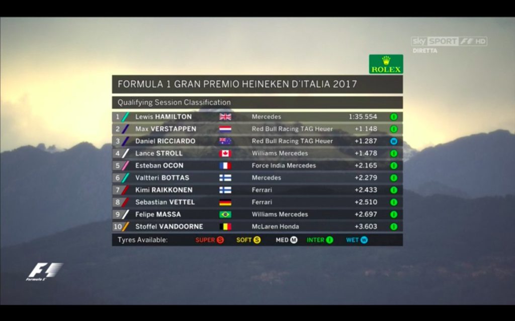che è diventato il pilota con più pole nella storia della F1, 69 con un giro pazzesco di 1.35.544, davanti alle due Red Bul di Max Verstappen e Daniel Ricciardo, che domani dovranno però cedere le loro posizioni per via delle penalità per la sostituzione di varie parti delle power unit. E quindi in prima fila accanto a Hamilton ci sarà la Williams con il suo rookie Lance Stroll, che ha chiuso con un fantastico 4° posto, d avanti alla Force India di Esteban Ocon, alla Mercedes di Valtteri Bottas e alle Ferrari di Kimi Raikkonen e Sebastian Vettel. A chiudere la top 10 la Williams di Felipe Massa e la McLaren di Stoffel Vandoorne.
