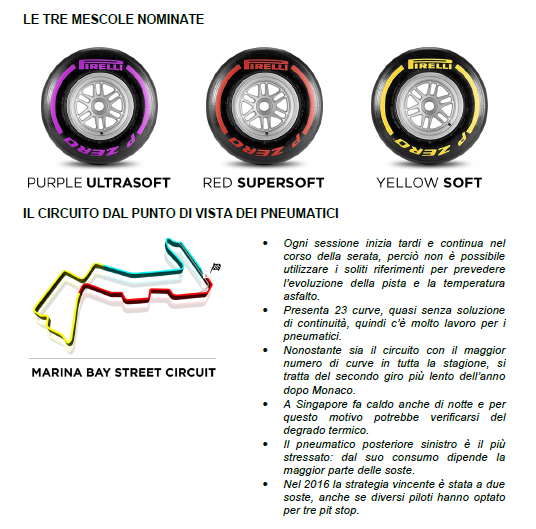 Dopo #Monza, una delle gare a sosta unica più semplici in termini di strategia, la #F1 approda sulle strade illuminate di #Singapore per uno dei GP tatticamente più complessi. Come nel 2016, sono state nominate le tre mescole più morbide del range – P Zero Yellow soft, Red supersoft e Purple ultrasoft – chiamate ad affrontare una gara di 61 giri che arriva quasi al li