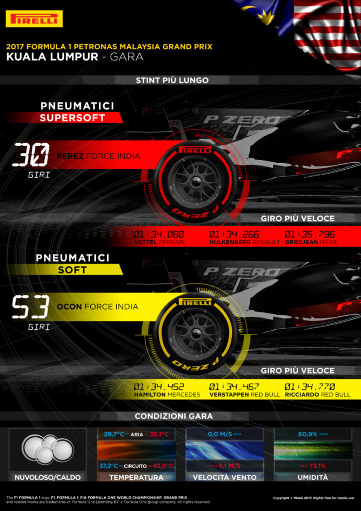 L’ultima edizione del GP della #Malesia è stata vinta da Max #Verstappen: partito dalla seconda fila, il pilota Red Bull ha effettuato un solo #pitstop da supersoft a soft. Questa strategia è stata scelta da tutti i leader, a eccezione di Sebastian Vettel, autore di una grande rimonta dal 19° fino al 4° posto finale. Il pilota tedesco era partito ultimo su pneumatici soft per cercare di recuperare posizioni, optando per le supersoft nell’unico pitstop effettuato nello stesso giro del leader della gara Verstappen, passato invece da supersoft a soft. In questo modo il pilota della Ferrari ha sfruttato la velocità extra data dai pneumatici supersoft, arrivando ai piedi del podio.