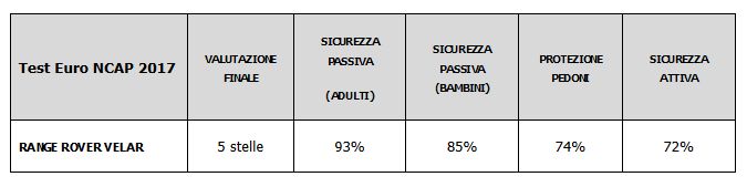 Euro NCAP, dal 2016 a oggi, ha testato 15 SUV: Jeep Compass, Mazda CX-5, Opel Granland X, Renault Koleos, Audi Q5 e Q2, Seat Ateca, Land Rover Discovery, Toyota C-HR, Ford Edge, Peugeot 3008 e 5008, Volkswagen Tiguan, Skoda Kodiaq e Alfa Romeo Stelvio, tutti hanno conquistato le cinque stelle. In questa categoria Velar raggiunge una delle migliori performance complessive con ottimi risultati in tutte le prove di sicurezza. Piccolissime ‘defaillance’ solo nella protezione dei passeggeri posteriori (zona torace e collo), nella prova dell’urto frontale. Eccellenti le prestazioni dei sistemi di assistenza alla guida.