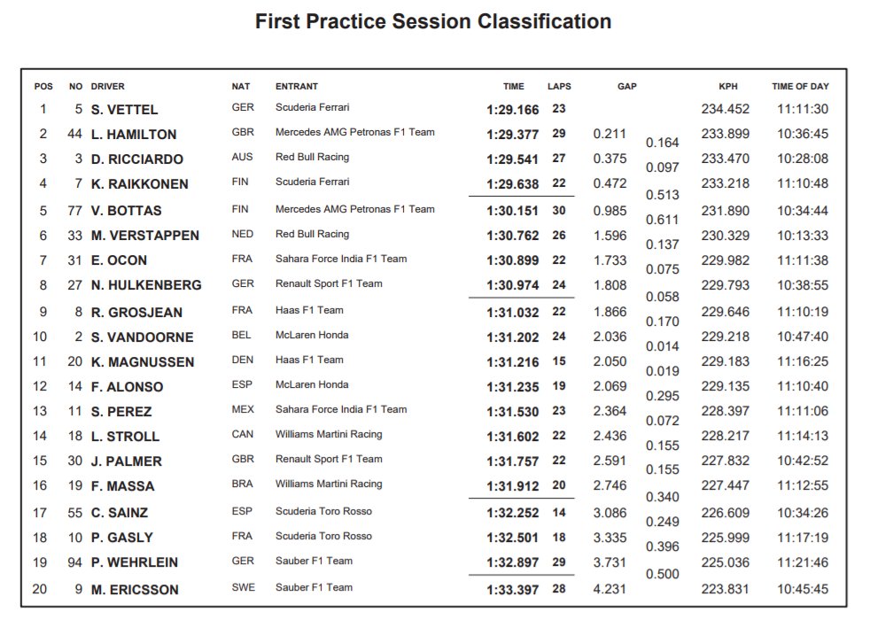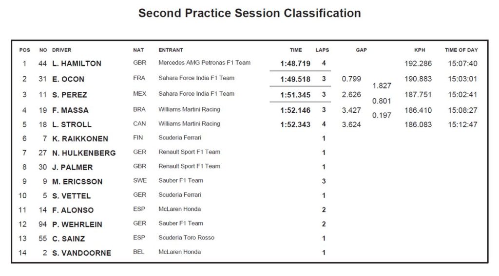 e sei che hanno scelto di non girare affatto. Condizioni così pessime che l’inizio delle seconde libere è stato rinviato “indefinitivamente” e quando dopo 45 minuti il semaforo rosso si è spento in pochissimi hanno deciso di uscire. A rompere il ghiaccio la Ferrari di Kimi Raikkonen per un giro esplorativo, ma i primi giri veri sono stati quelli delle Force India di Sergio Perez ed Esteban Ocon, che ha fatto un tempo di 1.49.518s, a 19 secondi dal miglior tempo delle FP1, l’1.29.166 di Sebastian Vettel sulle supersoft, a poco più di 2 decimi da Hamilton.