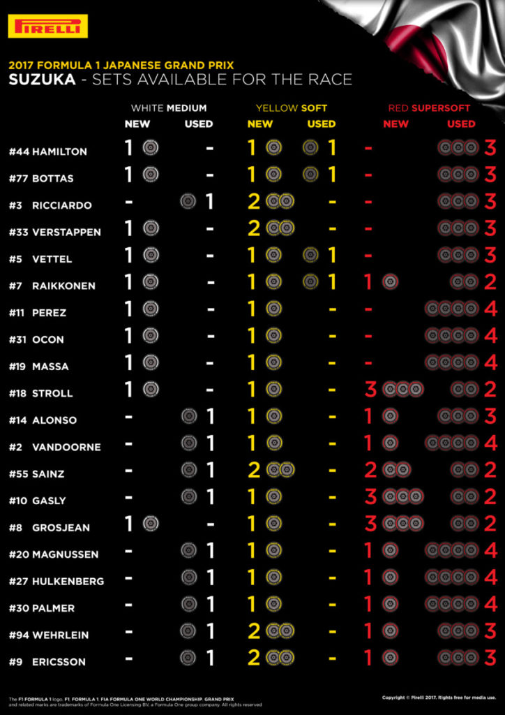 MARIO ISOLA – RESPONSABILE CAR RACING “L’eccezionale pole di Lewis Hamilton, che annulla il precedente record del circuito di Suzuka, evidenzia il ritmo imposto dalle monoposto e dai pneumatici 2017, nonostante venerdì le simulazioni di gara siano state interrotte dal maltempo e dalle bandiere rosse. La pole di quest’anno è 3,3 secondi più veloce rispetto a quella 2016, con i pneumatici supersoft che si sono comportati perfettamente. In gara la maggior parte dei piloti potrebbe optare per due pit stop, visto che questo circuito è tra quelli che impongono i carichi maggiori sui pneumatici in tutto l’anno. Nel corso delle qualifiche abbiamo visto diverse strategie in pista, con due dei piloti che avranno penalità in griglia che hanno scelto di partire su pneumatici soft. Questa scelta dovrebbe permettere loro di recuperare posizioni, grazie a un primo stint più lungo rispetto ai diretti rivali. Lo scorso weekend in Malesia abbiamo visto che con la giusta strategia è possibile ottenere un buon risultato anche se si parte dalle retrovie”.