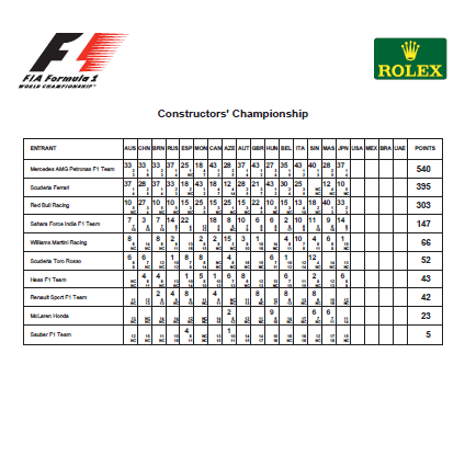 Questo ha lasciato via libera alle Red Bull, con un Max Verstappen sempre alle calcagna di Hamilton, passato da 5 secondi a uno solo nelle fasi conclusive. E in fase di doppiaggio, Fernando Alonso sotto i riflettori, come una settimana fa in Malesia, facendo passare Hamilton e non l’olandese, cosa sotto investigazione da parte della FIA (punita con 2 punti sulla patente). Ma sinceramente la cosa ci sembra assurda. Stesso schema tra Valtteri Bottas e Daniel Ricciardo, ma il pilota della  Mercedes ha dovuto accontentarsi del 4° posto (con la soddisfazione del miglior giro in gara), davanti alla Ferrari del connazionale Kimi Raikkonen, alle Force India di Esteban Ocon e Sergio Perez, alle Haas di Kevin Magnussen e Romain Grosjean con la Williams di Felipe Massa a completare la top 10.