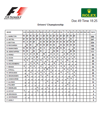 La classifica vede adesso Hamilton a quota  306 punti, con Vettel a 247 e Bottas a 234. Nel Costruttori, Mercedes ormai imprendibile a 540, con la Ferrari a 395 e la Red Bull a 303, seguita da Force India, Williams e Toro Rosso (rispettivamente a 147, 66 e 52). A questo punto finalmente pausa, prima del GP degli USA. A Hamilton bastano 16 punti su Vettel per conquistare matematicamente il quarto Titolo. Chissà che gli americani di Liberty Media non sognino proprio che il loro primo Mondiale si concluda in casa… Abbiamo iniziato dicendo “emozioni all’inizio e alla fine”: sì, perché in effetti è stato uno dei GP del Giappone più piatti che si siano mai visti. – 12 sorpassi in pista, di cui 10 fatti da Raikkonen Per concludere, ringraziamo di cuore per averci fatto rivedere a bordo pista il trattore, dopo l’uscita della Williams di Stroll. Certo, c’era la VSC, ma c’era ancora il trattore. Lo stesso di Jules Bianchi, tre anni fa… A sottolineare ulteriormente l’inutilità della VSC, che elimina i vantaggi e ricompatta il gruppo, uccidendo proprio quello spettacolo tanto invocato. Ma non elimina i pericoli a bordo pista, perché le velocità dei piloti non erano “codice”…