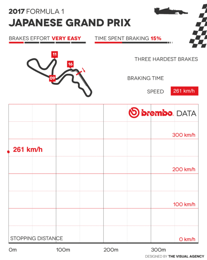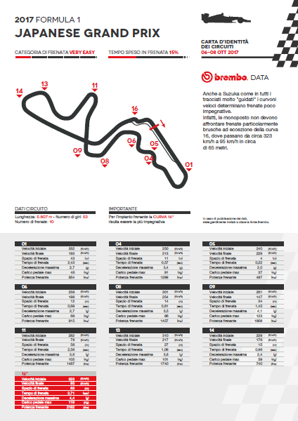 Delle 10 frenate di Suzuka nessuna è classificata dai tecnici Brembo come impegnativa per i freni, 4 sono di media difficoltà e le restanti 6 sono light. La più impegnativa in assoluto è la curva 16, teatro di una perdita di velocità da 323 km/h a 95 km/h in soli 65 metri. Durante i 2,71 secondi di funzionamento dei freni i piloti esercitano un carico sul pedale di 119 kg e sono soggetti ad una decelerazione massima di 4,4 g. Il carico sul pedale del freno è maggiore alla curva Degner (curva 9): 123 kg ma la frenata si protrae per meno spazio (34 metri) e tempo (1,45 secondi) perché le monoposto riescono ad affrontare la curva a 147 km/h e quindi perdono solo 114 km/h. All’Hairpin (curva 11) il delta di velocità torna a superare i 200 km/h (da 282 km/h a 78 km/h) complice un ricorso ai freni per 2,56 secondi durante i quali le auto percorrono 58 metri. Minore è invece lo stress fisico per il pilota: 3,6 g di decelerazione e 105 kg di carico sul pedale del freno.