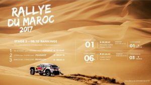 Le #PEUGEOT #3008DKR hanno confermato competitività e affidabilità, portando a casa un ottimo doppio podio nella tappa 3 del Rally del #Marocco, con Sébastien LOEB / Daniel ELENA, secondi, e Carlos SAINZ /Lucas CRUZ, terzi. Sébastien LOEB e Daniel ELENA sono partiti settimi. Hanno fatto una gara intelligente, guidando la PEUGEOT 3008DKR a una velocità media di 100 km/h e sono stati prudenti tra le dune dell’ultima parte della speciale. Concludono al 2° posto della tappa e conservano il comando in classifica generale, con un vantaggio di 3 minuti e 46 secondi.