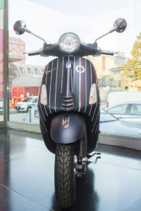 La personalizzazione di Garage Italia Custom del modello preparato per il vincitore della Targa Bonetto di quest’anno enfatizza ulteriormente lo stile unico del motociclo Piaggio, con dettagli su misura davvero esclusivi. La Vespa “indossa” ora un abito gessato, grazie alla speciale verniciatura dello scudo anteriore e la sella, rivestita in ecopelle marinizzata di colore rosso carminio con cuciture in tinta, è totalmente resistente all’acqua.