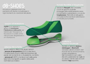 Dal punto di vista tecnologico e formale, il progetto interpreta in modo brillante il tema dell’ausilio sanitario, contesto poco frequentato dal design. La struttura è caratterizzata da una suola tecnologica fissa e una tomaia intercambiabile flessibile e traspirante che si adatta al piede senza comprimerlo. Nella suola, tre sensori (di temperatura, del pH e dell’idratazione) collegati a una batteria ricaricabile posta sempre nella suola, e a un sistema Bluetooth collegato a una App sullo smartphone, permettono di monitorare le condizioni del piede e individuare l’insorgere di alterazioni pericolose per la salute dell’utente.