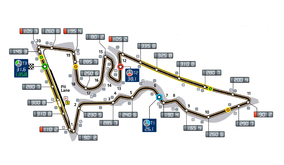 12, è opera del celebre architetto Hermann Tilke: 20 curve distribuite su una lunghezza di 5,513 chilometri. Qui si corre in senso antiorario e i giri da percorrere in gara saranno 56: il suo layout si ispira ad alcuni dei più noti settori di altri circuiti che hanno fatto la storia della Formula 1. È il caso, ad esempio, del tratto che va dalla 3 alla 6: ricorda molto la mitica sequenza Maggots-Becketts-Chapel di Silverstone. O il tratto racchiuso tra la curva 16 e 18 che è una vera e propria replica della mitica curva 8 dell’Intercity Instanbul Park. Inoltre, ulteriori analogie si possono individuare con alcuni settori di Hockenheim, Interlagos e del Red Bull Ring di Spielberg.
