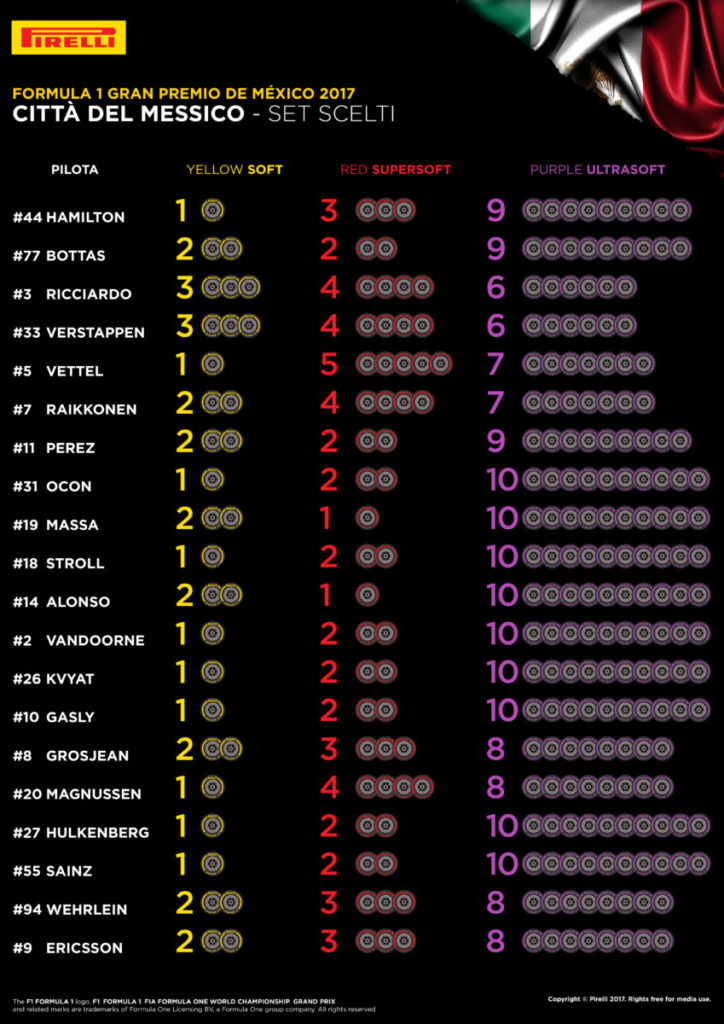 La #FIA ha comunicato a #Pirelli il numero di set di pneumatici e relative mescole scelti da ciascun pilota per il GP del #Messico, diciottesimo e terz’ultimo round del Campionato del Mondo di F1 2017, in programma dal 27 al 29 ottobre prossimi.