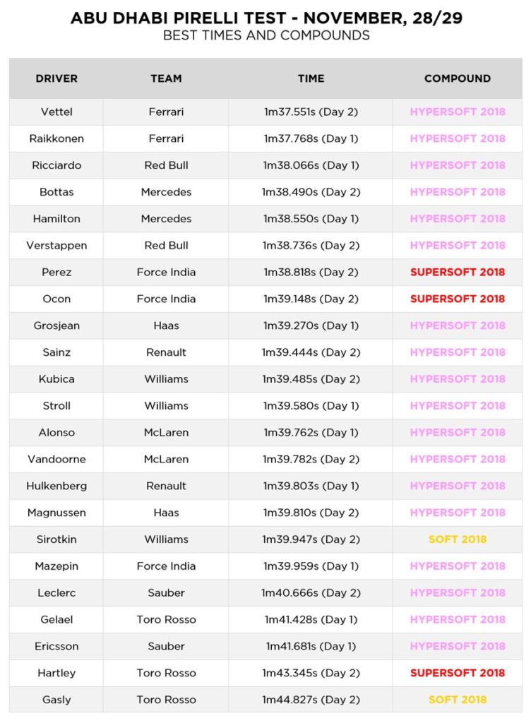 Ad Abu Dhabi si sono conclusi i due giorni di test pneumatici Pirelli 2018 che hanno visto impegnati tutti i team di Formula 1. Il più veloce oggi è stato Sebastian Vettel, proprio sulla nuova mescola P Zero Pink hypersoft, definita da Lewis Hamilton “il miglior pneumatico mai prodotto da Pirelli“.
