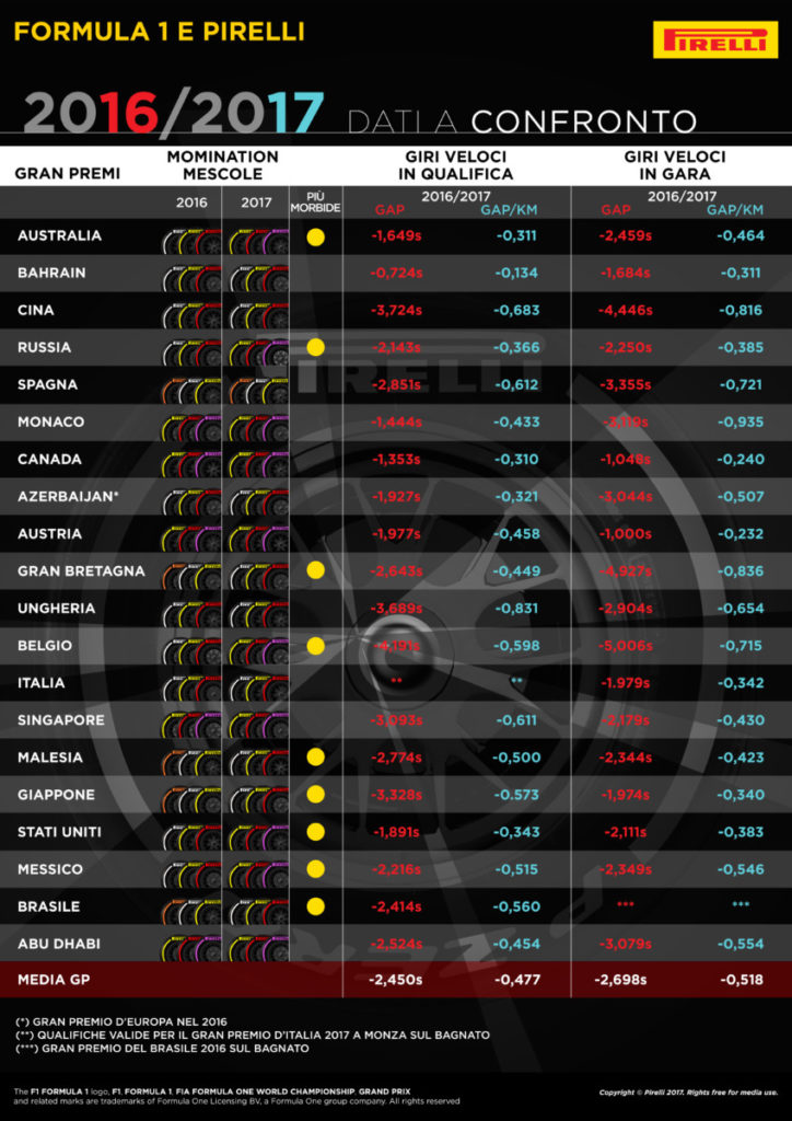 Mario Isola, Responsabile Car Racing di Pirelli: “Da una stagione da record abbiamo numeri da record. La Formula 1 ha introdotto nel 2017 regolamenti tecnici rivoluzionari, che hanno portato le monoposto a diventare le più veloci di sempre. Quindi il nostro obiettivo era quello di realizzare i pneumatici più prestazionali di sempre, più larghi del 25% rispetto ai precedenti per far fronte all’incremento dei carichi e delle velocità in curva e che tuttavia permettessero ai piloti di spingere al massimo da inizio a fine di ogni stint. Abbiamo raggiunto questo risultato con i test nel 2016 effettuati con monoposto muletto, non con le vetture da gara che non hanno mai visto i nuovi pneumatici prima dei test prestagionali di Barcellona. Nel corso di quest’anno, la pole position è stata in media 2,450 secondi più veloce rispetto al 2016, mentre il giro veloce in gara è stato in media inferiore di 2,968 secondi. Nonostante l’incremento dei carichi fino al 35-40% nelle curve più veloci, i nostri pneumatici 2017 hanno raggiunto tutti gli obiettivi prefissati a inizio stagione, con un ottimo livello di affidabilità e costanza nelle prestazioni. Per il 2018 abbiamo sviluppato un pneumatico ancora più veloce, il Pink hypersoft, e ogni mescola sarà di uno step più morbida rispetto allo scorso anno: in futuro ciò dovrebbe contribuire ad aumentare ancora di più le velocità e lo spettacolo”.