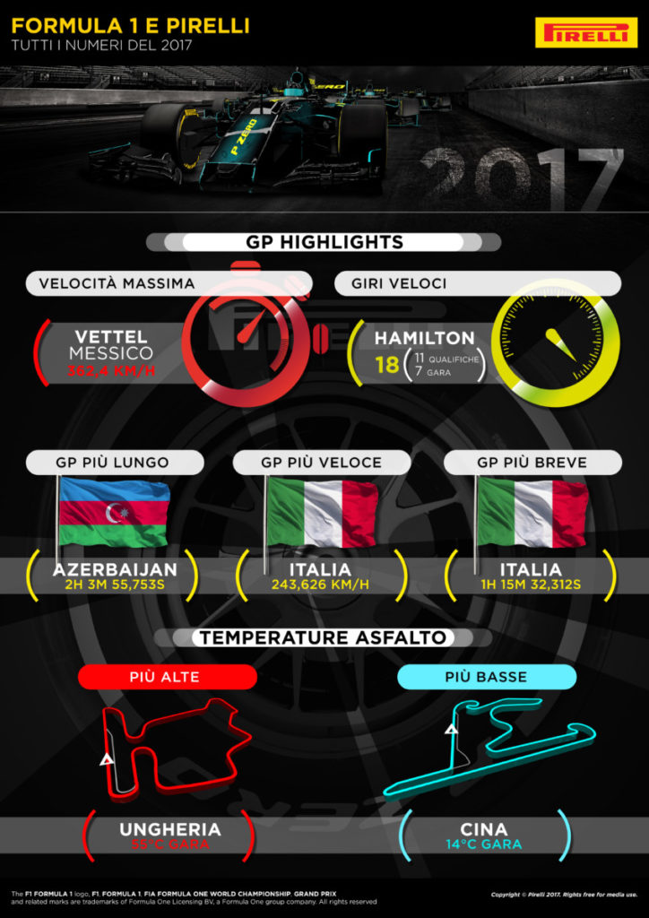 – Velocità massima raggiunta in gara dai pneumatici Pirelli P Zero Formula 1: 362,4 kmh, Sebastian Vettel in Messico.