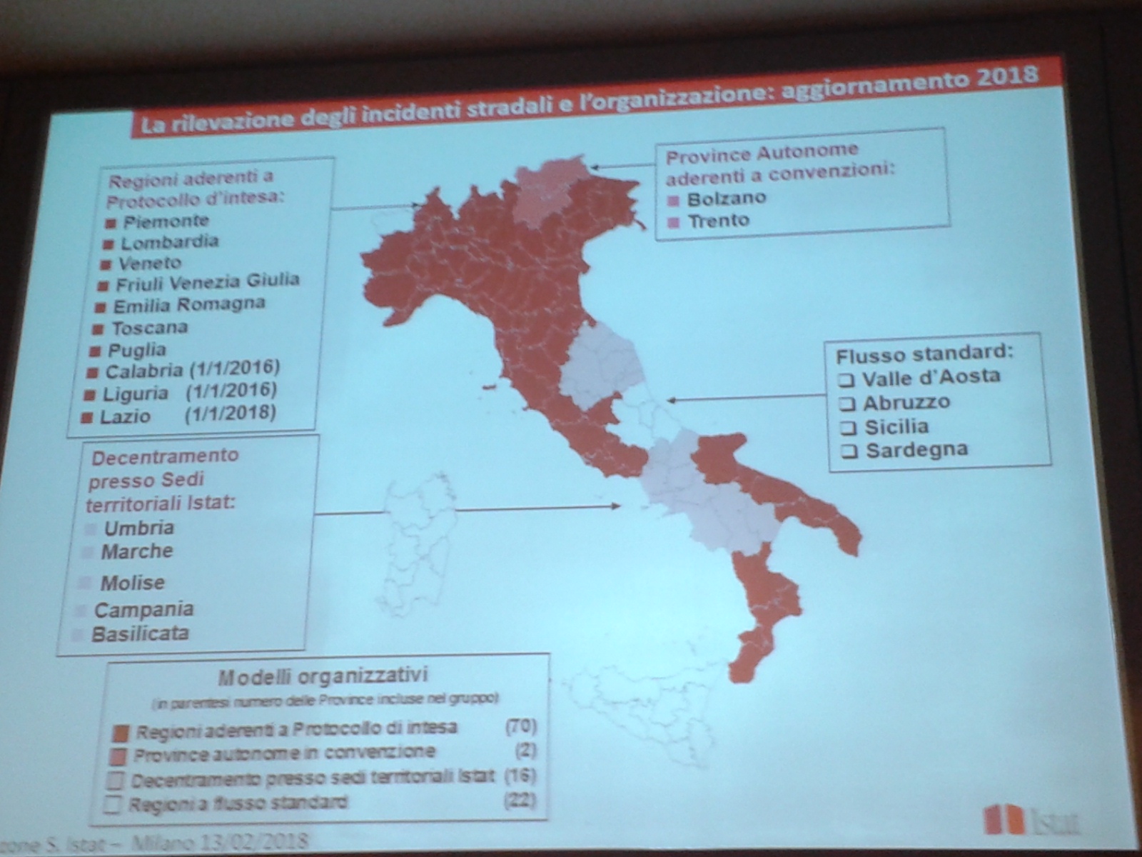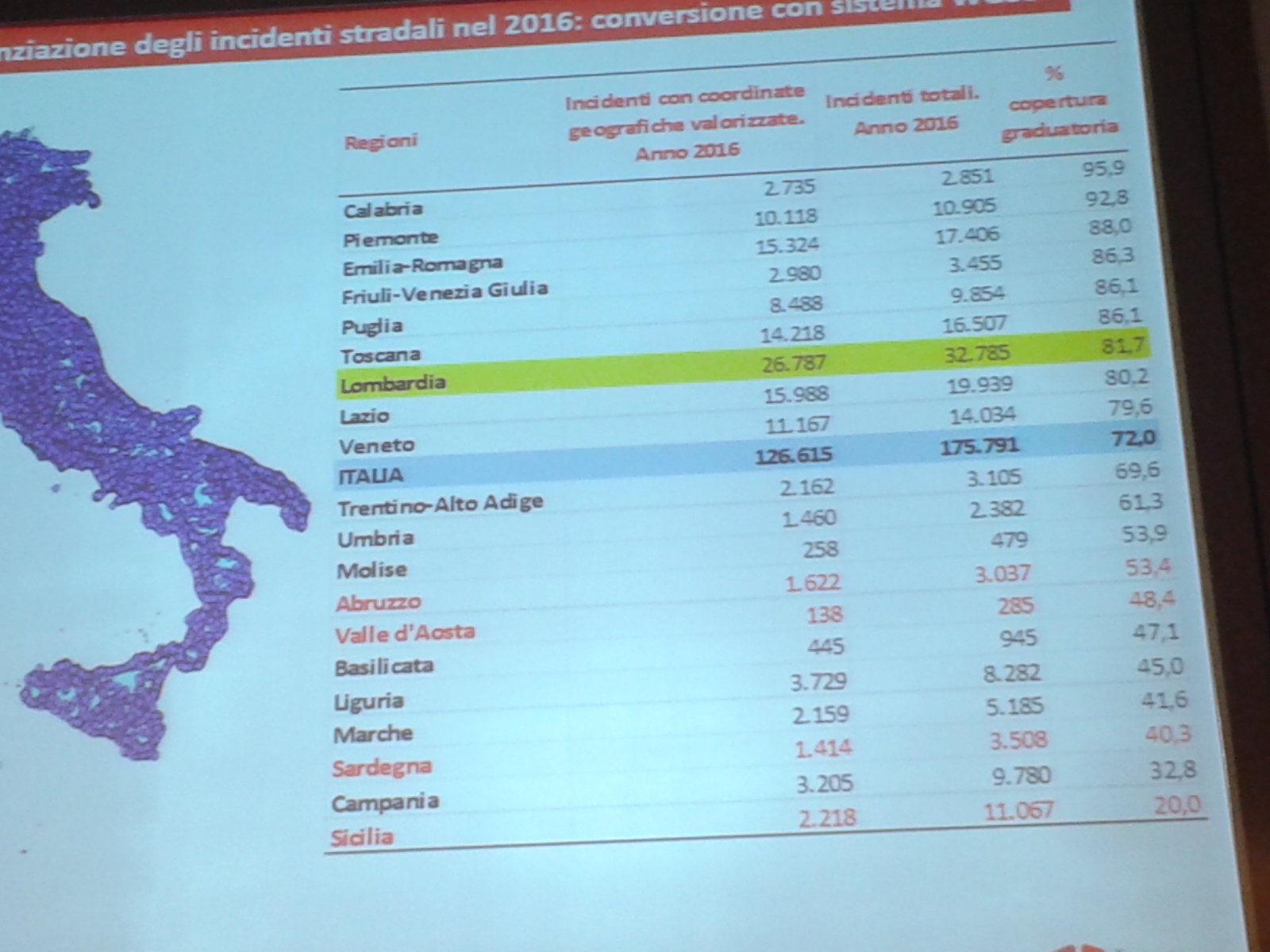 Lucia Pennisi, responsabile Area statistica dell’Automobile Club d’Italia, ha sottolineato l’importanza dell’elaborazione effettuata per localizzare gli incidenti stradali sulla rete viaria principale particolarmente utile per individuare le tratte più a rischio incidenti su cui effettuare le ispezioni. In Lombardia questa rete stradale si contraddistingue per un’alta densità di incidenti (con 1,35 incidenti per chilometro che è pari due volte la media nazionale) con un indice di mortalità pari a 2,34. I km più a rischio incidenti si trovano sulle tangenziali est e ovest milanesi e sulle strade statali 36 del lago di Como, 35 dei Giovi, 9 Emilia, 336 dell’Aeroporto della Malpensa.